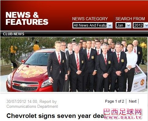 曼联胸前广告商又要换了,曼联官网今日宣布,他们已经和通用汽车品牌雪佛兰签下了7年的赞助合同,从2014/15赛季开始,曼联球员将穿上印有雪佛兰字样的球衣比赛。 目前曼联球衣赞助商是Aon,而雪佛兰也将成为曼 ...
